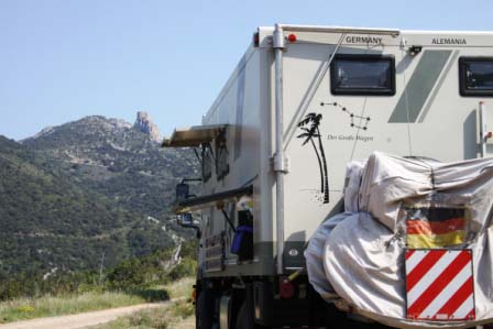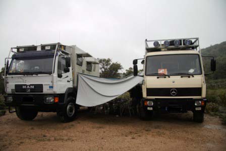 Wir lassen uns aber die gute Laune nicht verderben, sondern spannen eine Plane zwischen den Trucks