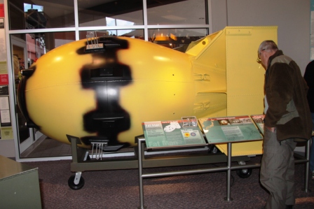 ein Nachbau in OriginalgröĂe der Bombe âLittle Boyâ, die Hiroshima zerstörte, sowie eine Nachbildung in